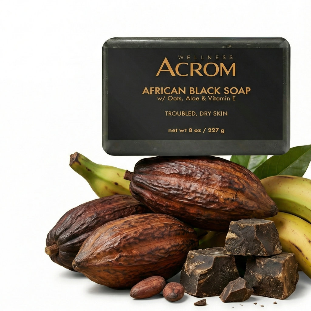 Most "African black soap" products sold commercially are either synthetic imitations mixed with detergents and dyes, or watered-down versions that lose effectiveness. Pure African Black Soap by Acrom™ is 100% authentic and handcrafted using traditional West African methods—plantain skins, cocoa pods, and palm oils are roasted and processed the same way they've been for centuries. This preserves all the natural cleansing compounds, vitamins, and minerals. It cleanses deeply without stripping your natural oils, which is why it works for both acne-prone and dry skin. And it's completely natural—no sulfates, parabens, or synthetic fragrances!