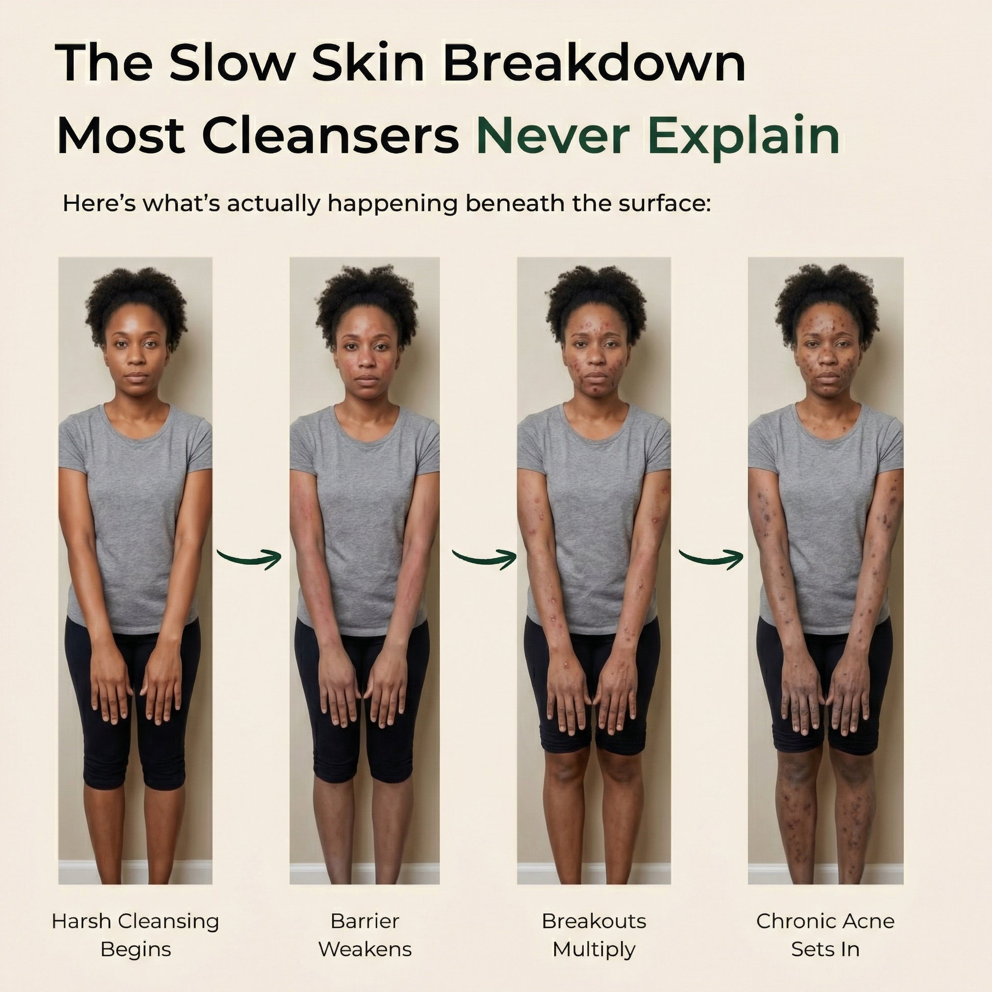 "Many commercial cleansers contain harsh sulfates and synthetic fragrances that strip the skin's natural protective barrier, leading to a cycle of excess oil production, inflammation, and breakouts.